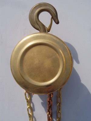 通過拽動手拉鏈條帶動手拉鏈輪、摩擦片、棘輪、制動器座、五齒長軸、片齒輪、短軸齒輪、花鍵孔齒輪、起重鏈輪轉動,最終帶動起重鏈條平穩的吊運重物。